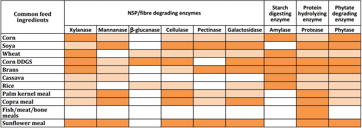 The Lumis enzyme raw material wheel clearly indicates the enzyme required to break down a particular component of the feed ingredient. For eg. : Amylase enzyme would act on starch components present in feed ingredients such as rice, cassava, corn/DDGS, wheat/brans which are a source of energy. Similarly protease would act on protein sources such as soya, fish, meat, bone meals etc.